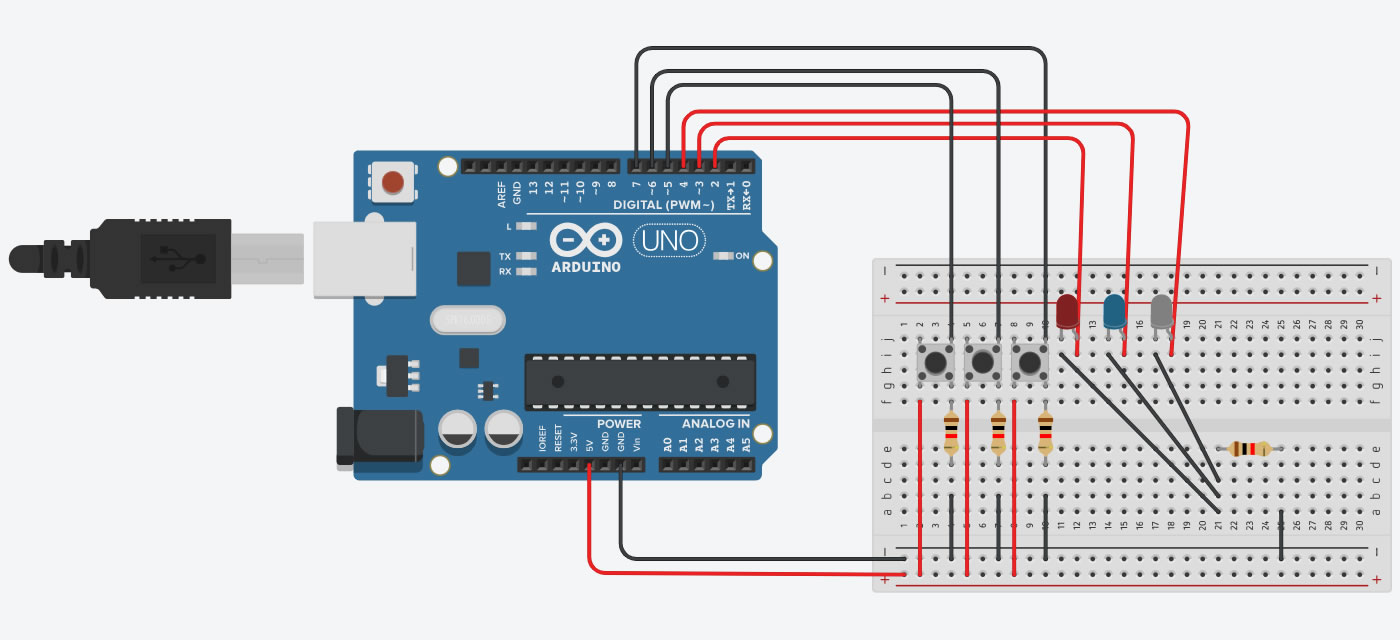 Let's start coding. First, we have to set which pin will be for input - for Buttons, and which for output - for LEDs. We have 3 buttons - so we will have 3 pins for input (5, 6 and 7). We have 3 Leds - so we will have 3 pins for output (2, 3 and 4).
